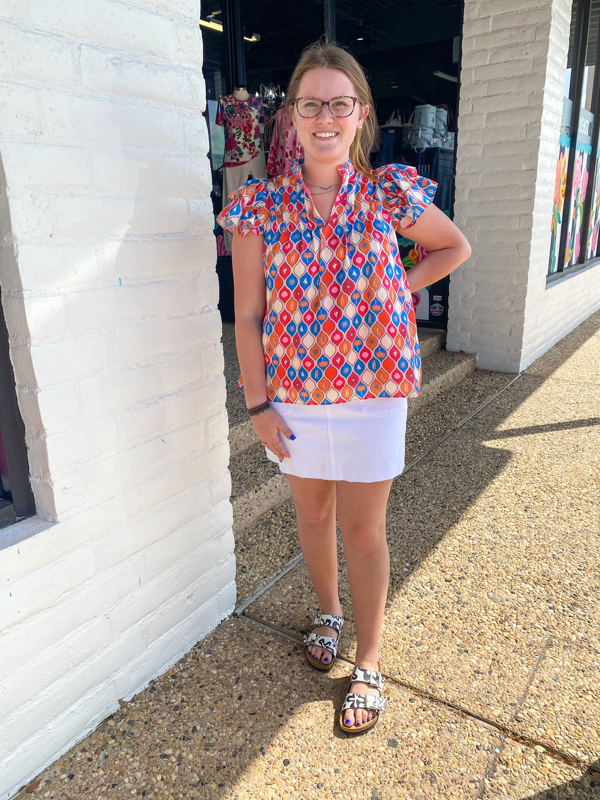 The top features a short flutter sleeve, a v-neck line and pleats across the chest.