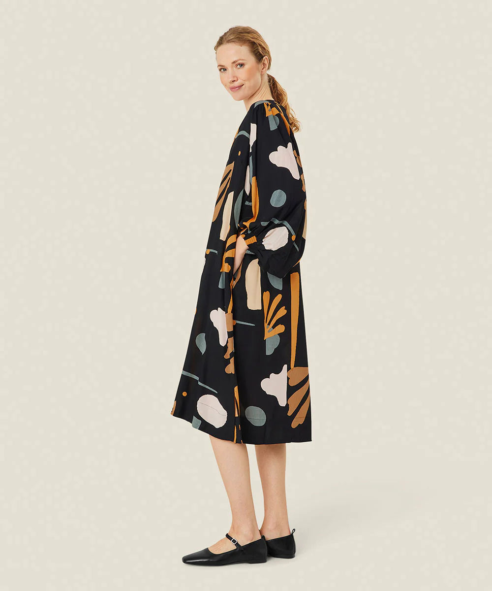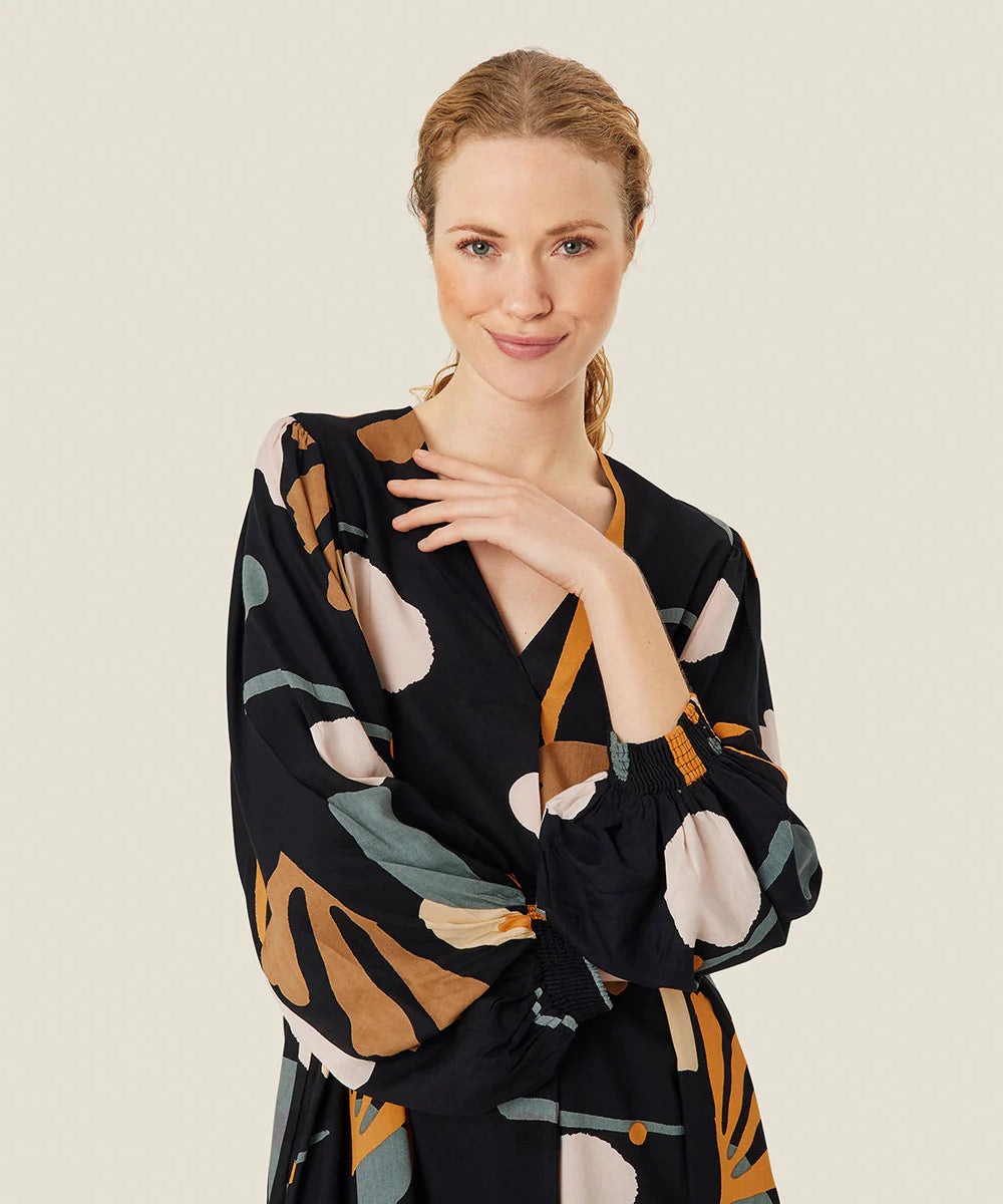 Get ready to turn heads in the Nalo Smocked-Sleeve Midi Dress. Featuring a classic black color with a unique earth tone pattern, this dress is designed in an A-shape to flatter every body type. And the best part? It has pockets! Perfect for a playful and stylish look.
