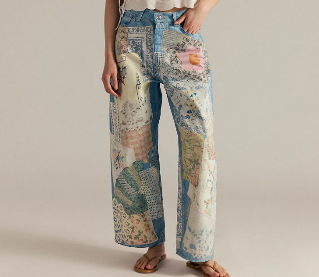 Features: Rigid denim fabrication, barrel-inspired legs, 5-pocket styling, digitally printed trompe-l'œil effect designed to mimic patchwork