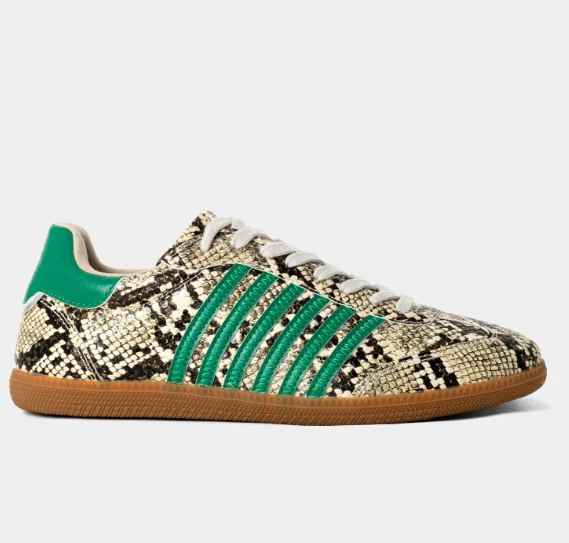 A wild twist on your everyday sneaker. STEVIE SNAKE takes our retro-inspired silhouette and amps it up with bold faux snake texture and rich green suede stripes. Set on a classic gum sole and finished with contrast laces, this style was made for turning heads-no matter where you're headed. Pair it with denim, cargo pants, or even a slip dress for effortless street chic.